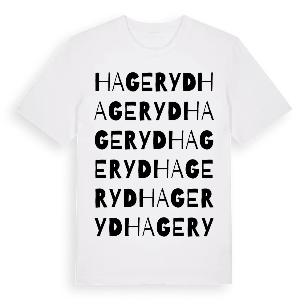 Hageryd ordlek t-shirt är inspirerad av Hageryd i Jönköpings län, Sverige. Tröjan är designad för dig som har en speciell koppling till platsen – oavsett om du bor här, har rötterna här eller bara älskar Hageryd.