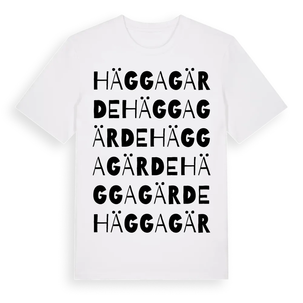 Häggagärde ordlek t-shirt är inspirerad av Häggagärde i Jönköpings län, Sverige. Tröjan är designad för dig som har en speciell koppling till platsen – oavsett om du bor här, har rötterna här eller bara älskar Häggagärde.