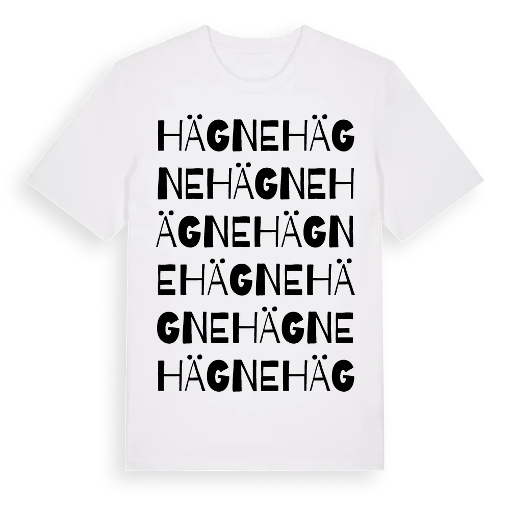Hägne ordlek t-shirt är inspirerad av Hägne i Jönköpings län, Sverige. Tröjan är designad för dig som har en speciell koppling till platsen – oavsett om du bor här, har rötterna här eller bara älskar Hägne.