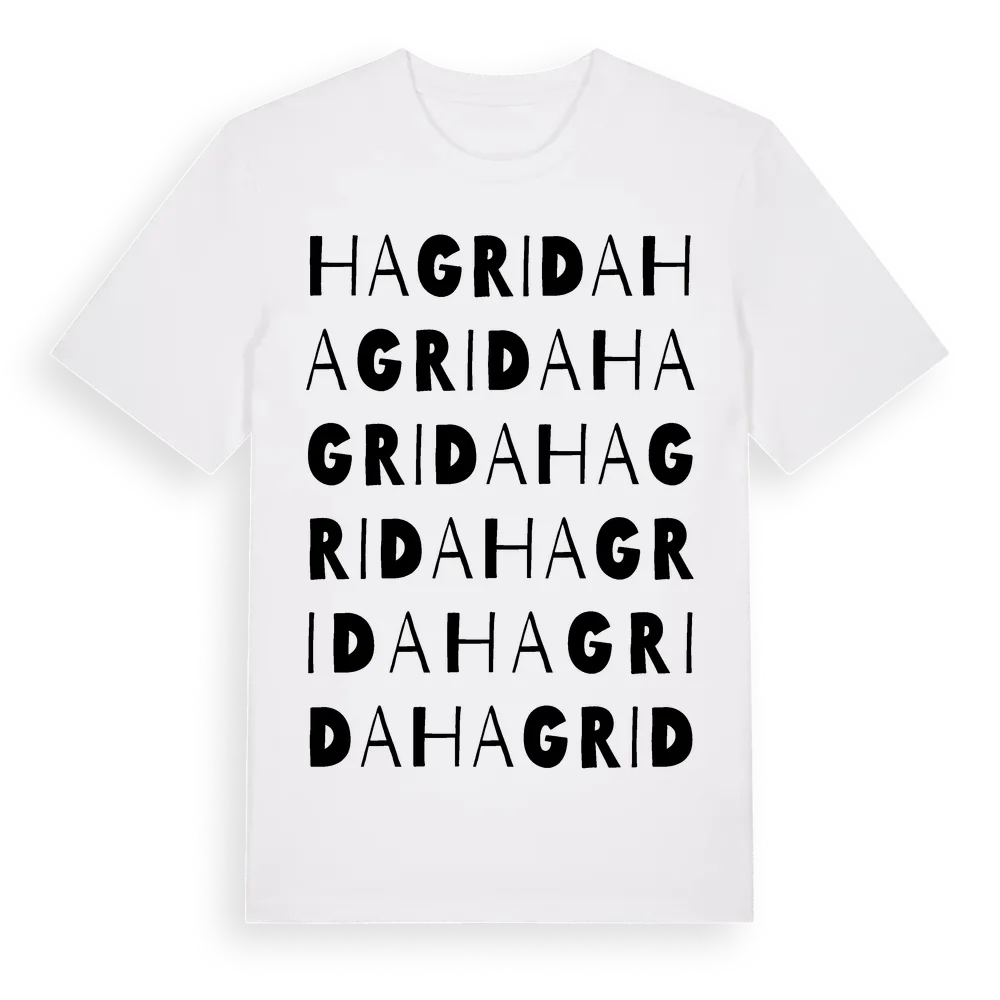 En ordlek byggd på Hagridas namn. Subtilt och klurig – ett motiv som bara de som verkligen känner platsen fullt ut förstår. Premium bomull, unisex – från Hagrida i Jönköpings län.