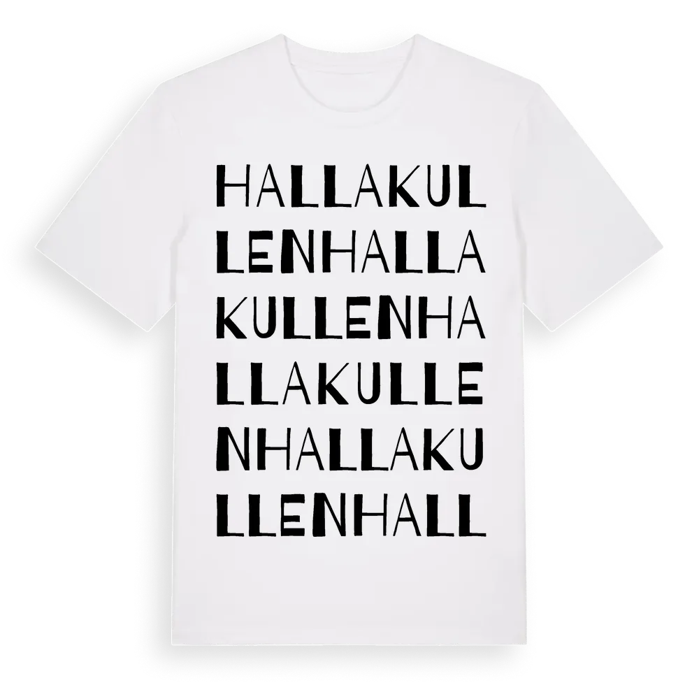 Hallakullen ordlek t-shirt är inspirerad av Hallakullen i Jönköpings län, Sverige. Tröjan är designad för dig som har en speciell koppling till platsen – oavsett om du bor här, har rötterna här eller bara älskar Hallakullen.