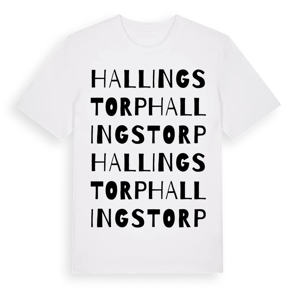 Hallingstorp ordlek t-shirt är inspirerad av byn Hallingstorp i Jönköpings län, Sverige. Tröjan är designad för dig som har en speciell koppling till platsen – oavsett om du bor här, har rötterna här eller bara älskar Hallingstorp.