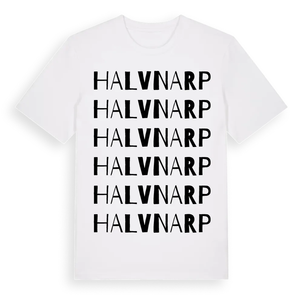 Halvnarp ordlek t-shirt är inspirerad av Halvnarp i Jönköpings län, Sverige. Tröjan är designad för dig som har en speciell koppling till platsen – oavsett om du bor här, har rötterna här eller bara älskar Halvnarp.