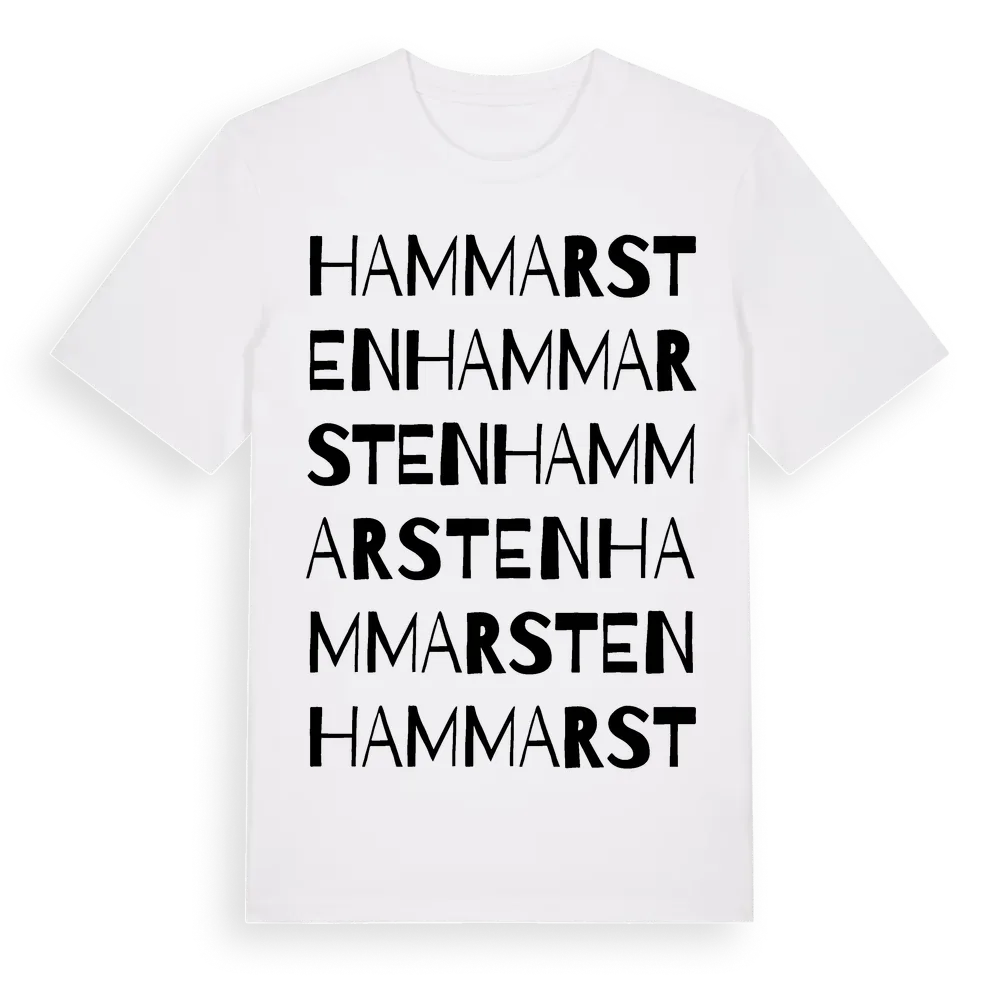 Hammarsten ordlek t-shirt är inspirerad av Hammarsten i Jönköpings län, Sverige. Tröjan är designad för dig som har en speciell koppling till platsen – oavsett om du bor här, har rötterna här eller bara älskar Hammarsten.