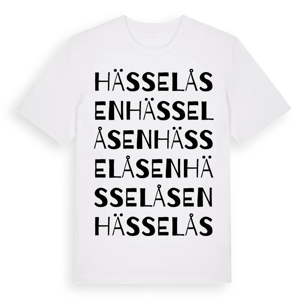 Hässelåsen ordlek t-shirt är inspirerad av Hässelåsen i Jönköpings län, Sverige. Tröjan är designad för dig som har en speciell koppling till platsen – oavsett om du bor här, har rötterna här eller bara älskar Hässelåsen.