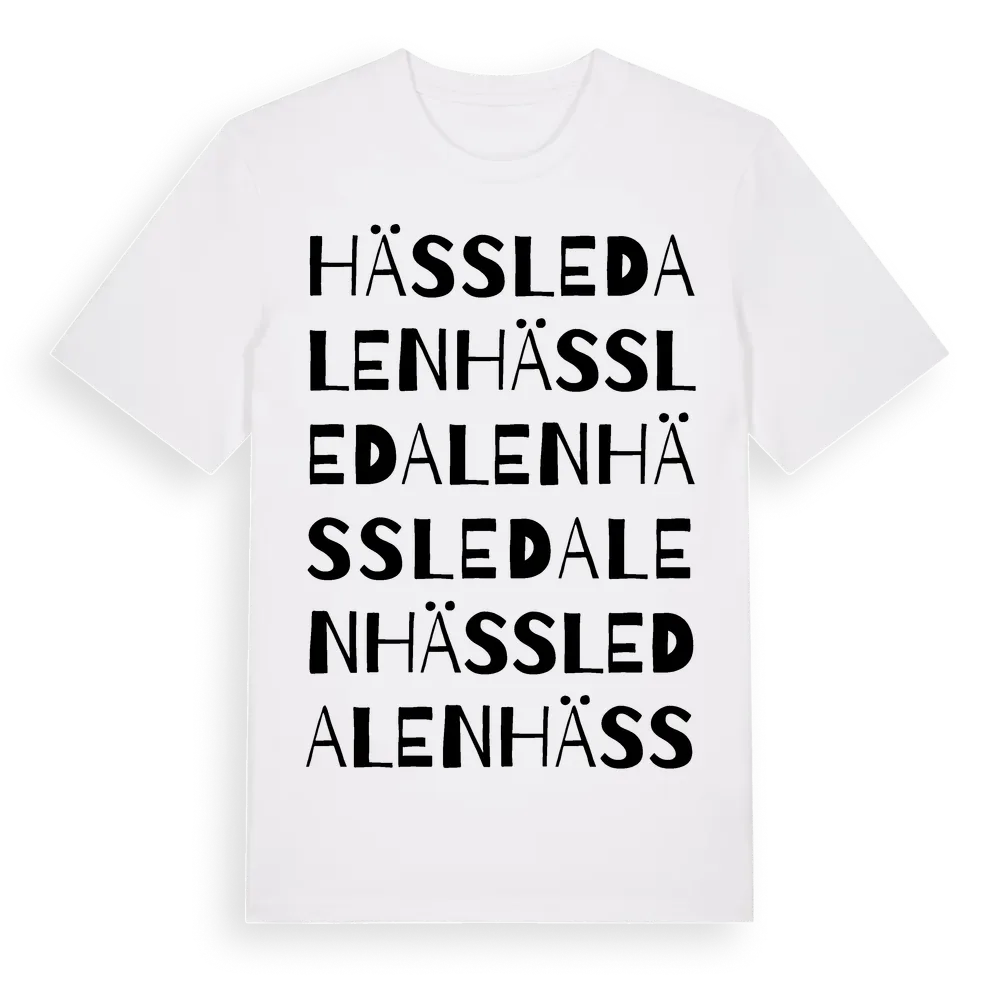 En ordlek byggd på Hässledalens namn. Subtilt och klurig – ett motiv som bara de som verkligen känner platsen fullt ut förstår. Premium bomull, unisex – från Hässledalen i Jönköpings län.