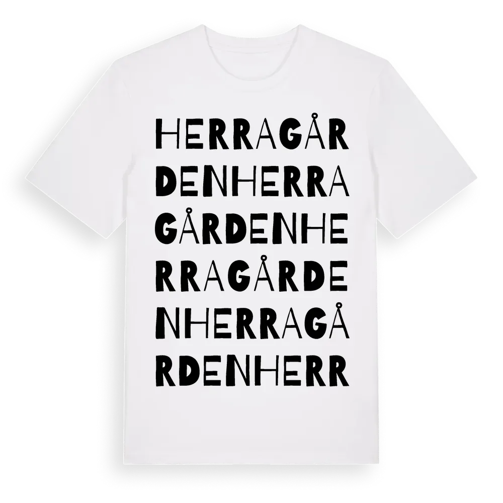 En ordlek byggd på Herragårdens namn. Subtilt och klurig – ett motiv som bara de som verkligen känner platsen fullt ut förstår. Premium bomull, unisex – från Herragården i Jönköpings län.