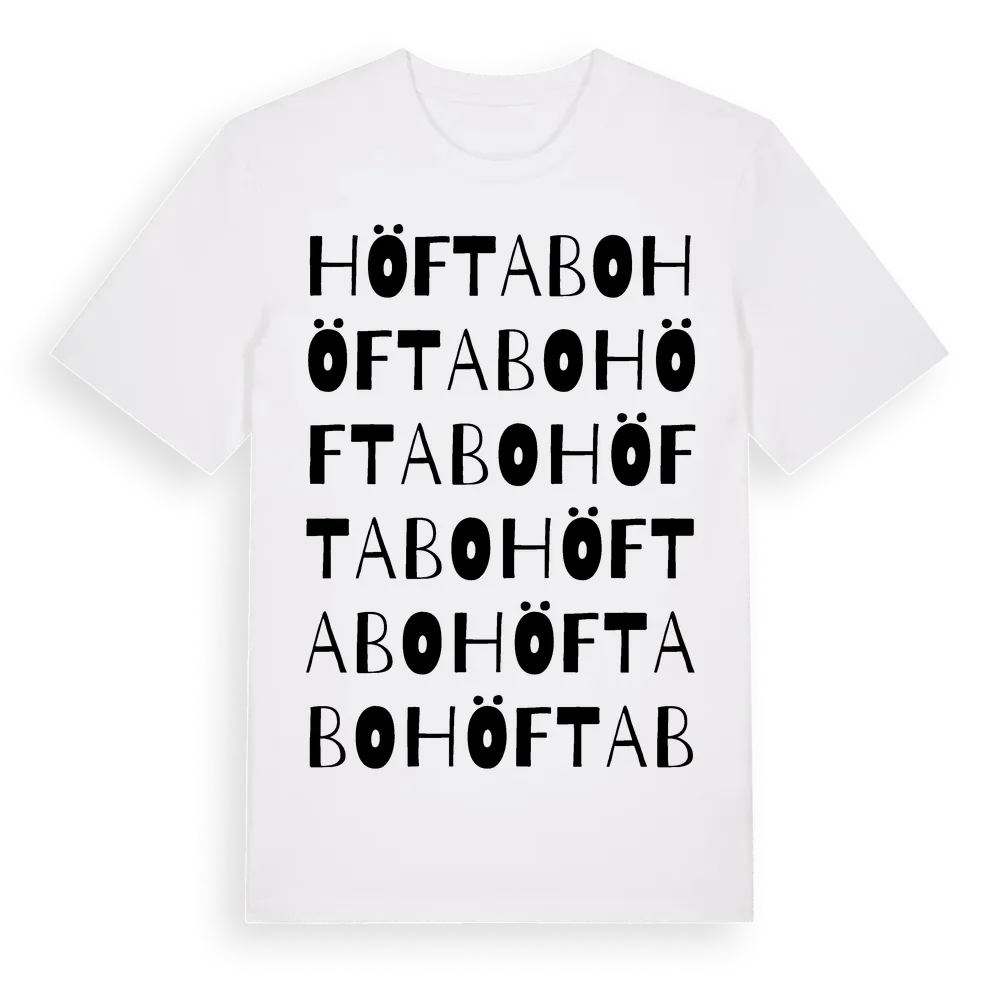 Höftabo ordlek t-shirt är inspirerad av Höftabo i Jönköpings län, Sverige. Tröjan är designad för dig som har en speciell koppling till platsen – oavsett om du bor här, har rötterna här eller bara älskar Höftabo.