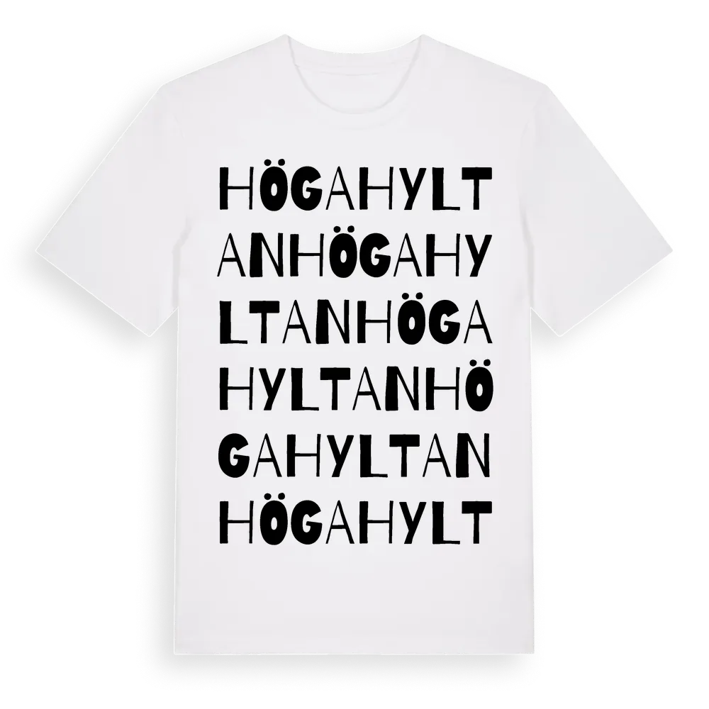 Högahyltan ordlek t-shirt är inspirerad av byn Högahyltan i Jönköpings län, Sverige. Tröjan är designad för dig som har en speciell koppling till platsen – oavsett om du bor här, har rötterna här eller bara älskar Högahyltan.