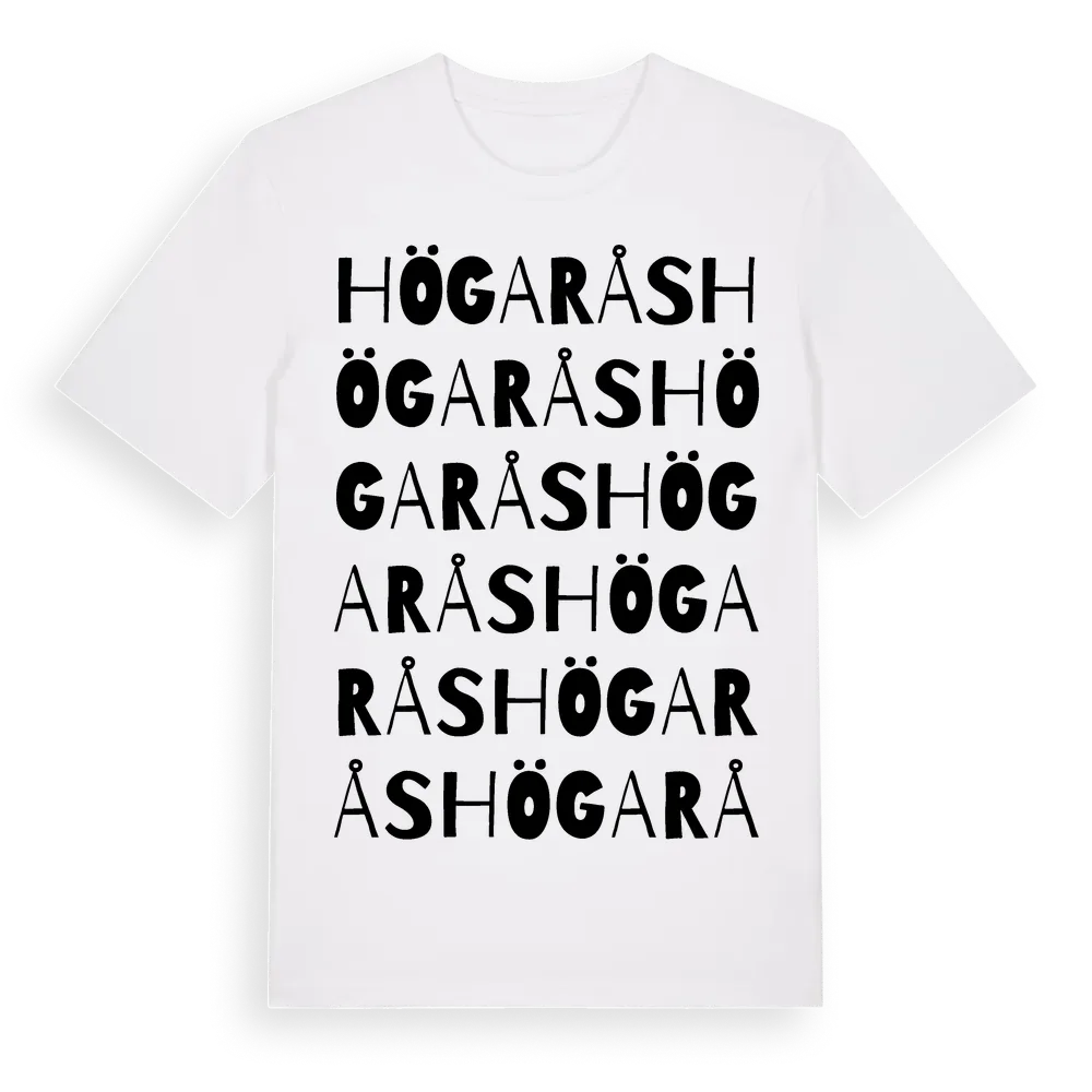 Högarås ordlek t-shirt är inspirerad av Högarås i Jönköpings län, Sverige. Tröjan är designad för dig som har en speciell koppling till platsen – oavsett om du bor här, har rötterna här eller bara älskar Högarås.