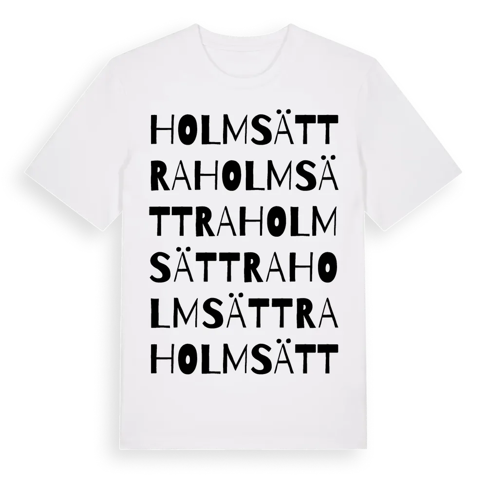 Holmsättra ordlek t-shirt är inspirerad av Holmsättra i Jönköpings län, Sverige. Tröjan är designad för dig som har en speciell koppling till platsen – oavsett om du bor här, har rötterna här eller bara älskar Holmsättra.