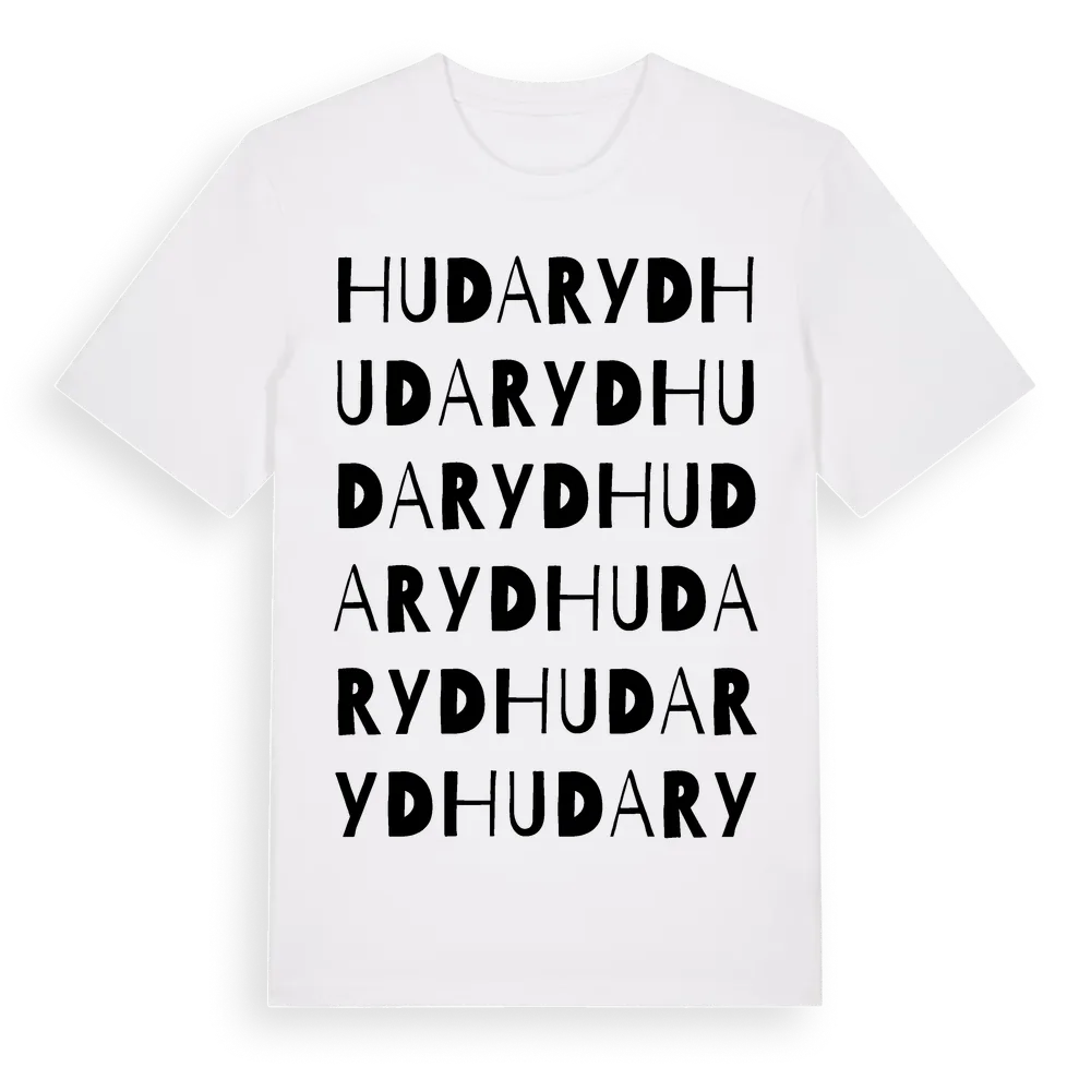 Hudaryd ordlek t-shirt är inspirerad av byn Hudaryd i Jönköpings län, Sverige. Tröjan är designad för dig som har en speciell koppling till platsen – oavsett om du bor här, har rötterna här eller bara älskar Hudaryd.