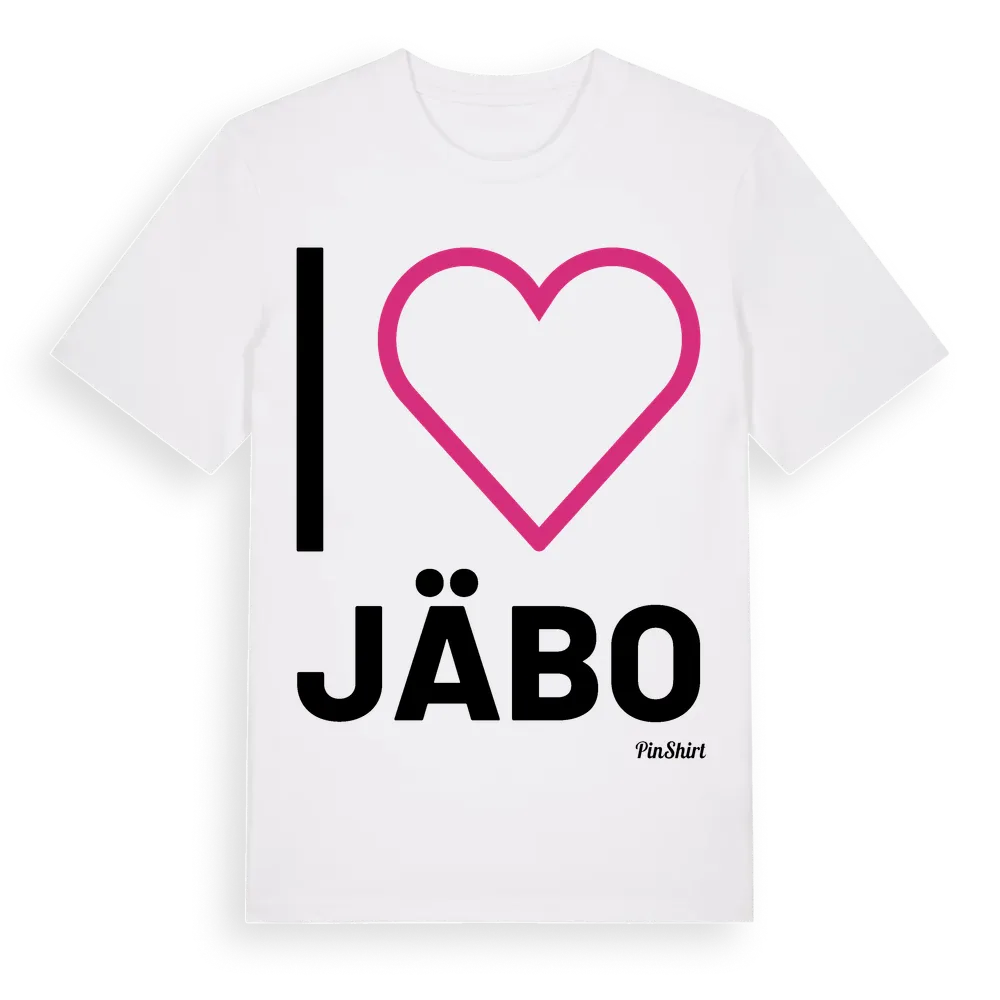 Det klassiska "I ❤ Jäbo"-motivet i stort format som täcker hela bröstet. För dig som vill visa kärleken till Jäbo på riktigt. Premium bomull, unisex – från byn Jäbo i Jönköpings län.