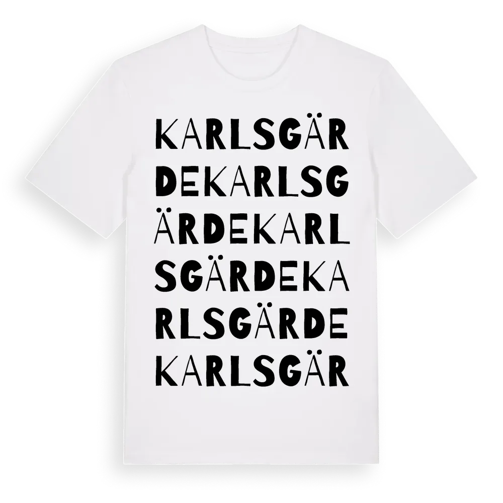 Karlsgärde ordlek t-shirt är inspirerad av byn Karlsgärde i Jönköpings län, Sverige. Tröjan är designad för dig som har en speciell koppling till platsen – oavsett om du bor här, har rötterna här eller bara älskar Karlsgärde.