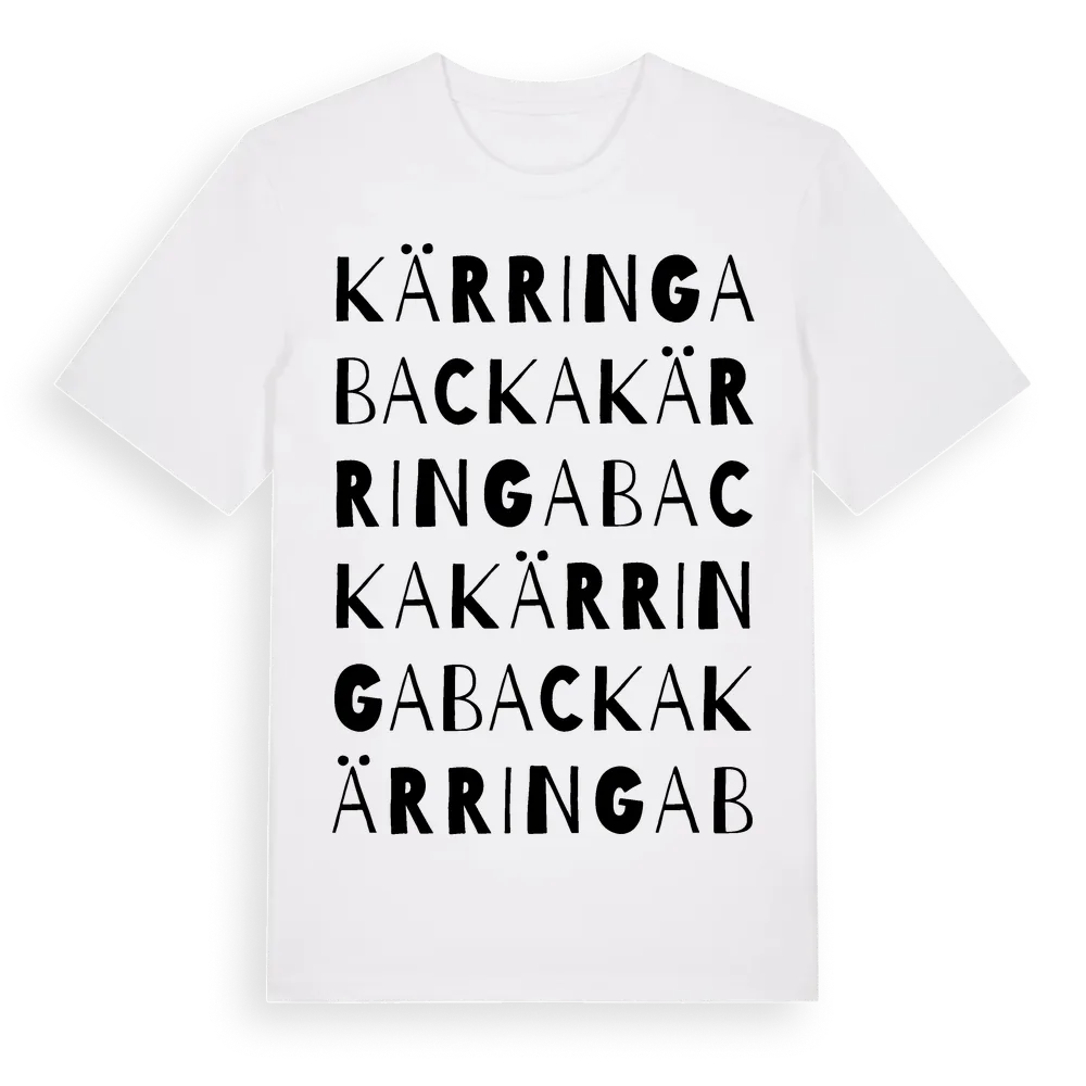 Kärringabacka ordlek t-shirt är inspirerad av byn Kärringabacka i Jönköpings län, Sverige. Tröjan är designad för dig som har en speciell koppling till platsen – oavsett om du bor här, har rötterna här eller bara älskar Kärringabacka.