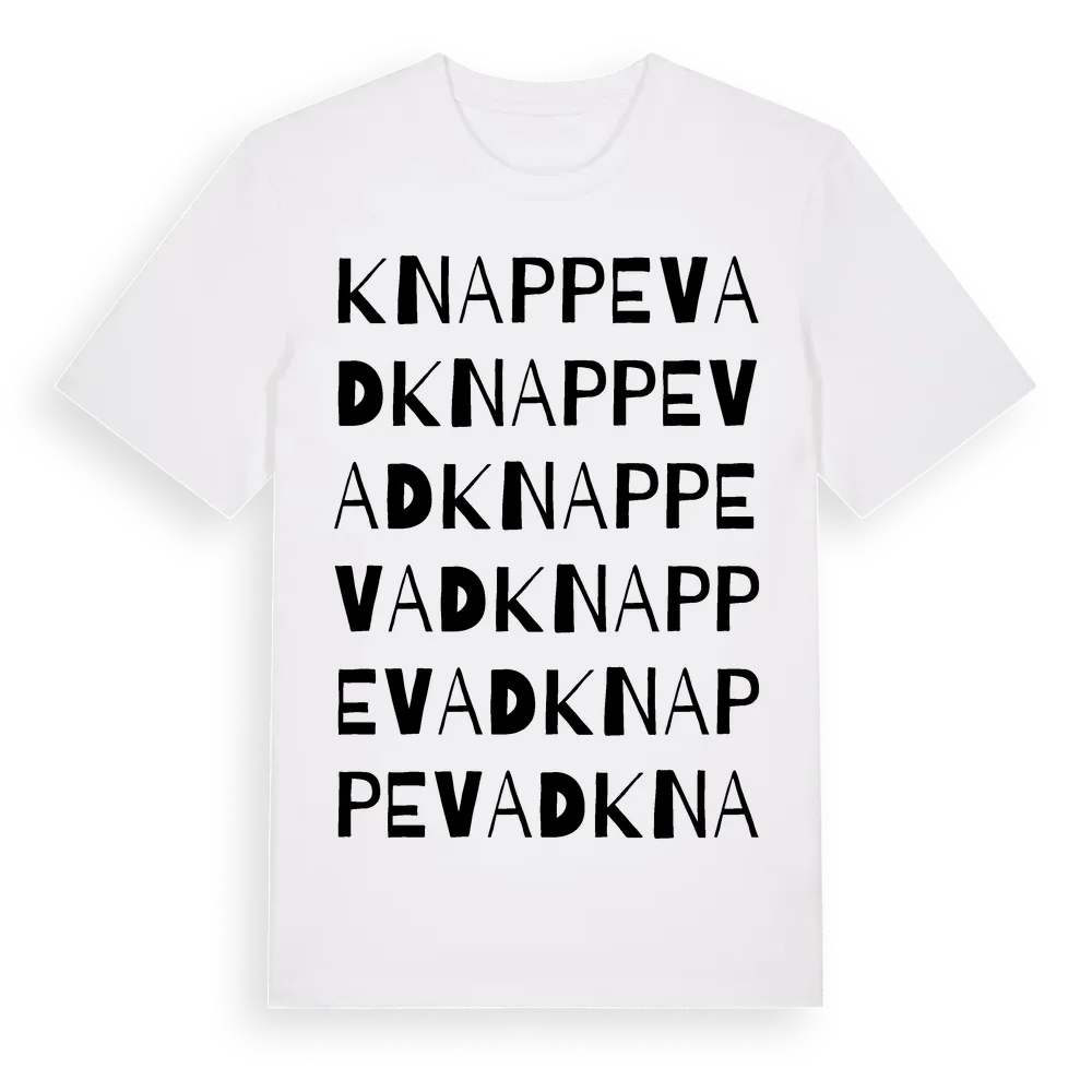 Knappevad ordlek t-shirt är inspirerad av Knappevad i Jönköpings län, Sverige. Tröjan är designad för dig som har en speciell koppling till platsen – oavsett om du bor här, har rötterna här eller bara älskar Knappevad.