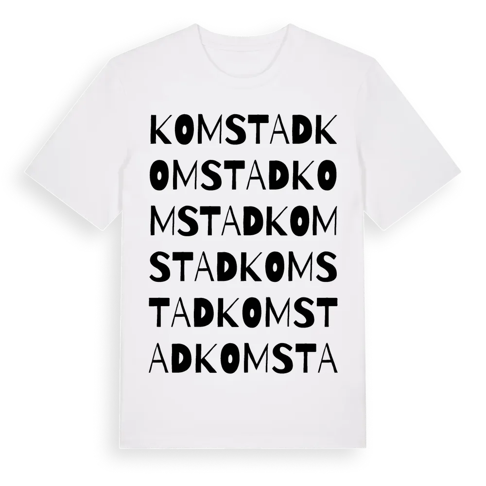 Komstad ordlek t-shirt är inspirerad av byn Komstad i Jönköpings län, Sverige. Tröjan är designad för dig som har en speciell koppling till platsen – oavsett om du bor här, har rötterna här eller bara älskar Komstad.