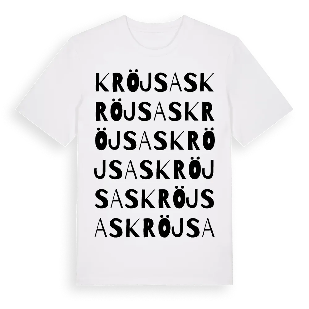 Kröjsas ordlek t-shirt är inspirerad av Kröjsas i Jönköpings län, Sverige. Tröjan är designad för dig som har en speciell koppling till platsen – oavsett om du bor här, har rötterna här eller bara älskar Kröjsas.