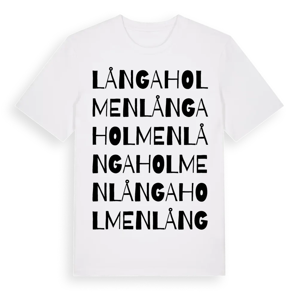 En ordlek byggd på Långaholmens namn. Subtilt och klurig – ett motiv som bara de som verkligen känner platsen fullt ut förstår. Premium bomull, unisex – från byn Långaholmen i Jönköpings län.