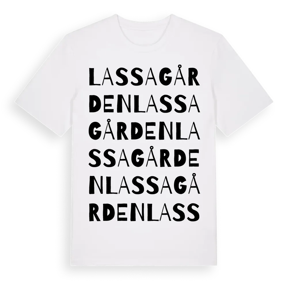 Lassagården ordlek t-shirt är inspirerad av Lassagården i Jönköpings län, Sverige. Tröjan är designad för dig som har en speciell koppling till platsen – oavsett om du bor här, har rötterna här eller bara älskar Lassagården.