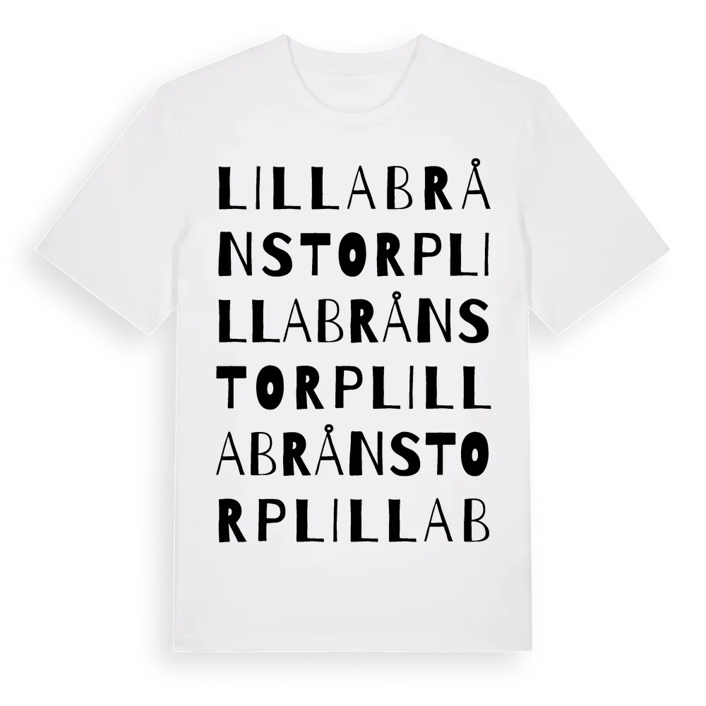 Lilla Brånstorp ordlek t-shirt är inspirerad av Lilla Brånstorp i Jönköpings län, Sverige. Tröjan är designad för dig som har en speciell koppling till platsen – oavsett om du bor här, har rötterna här eller bara älskar Lilla Brånstorp.