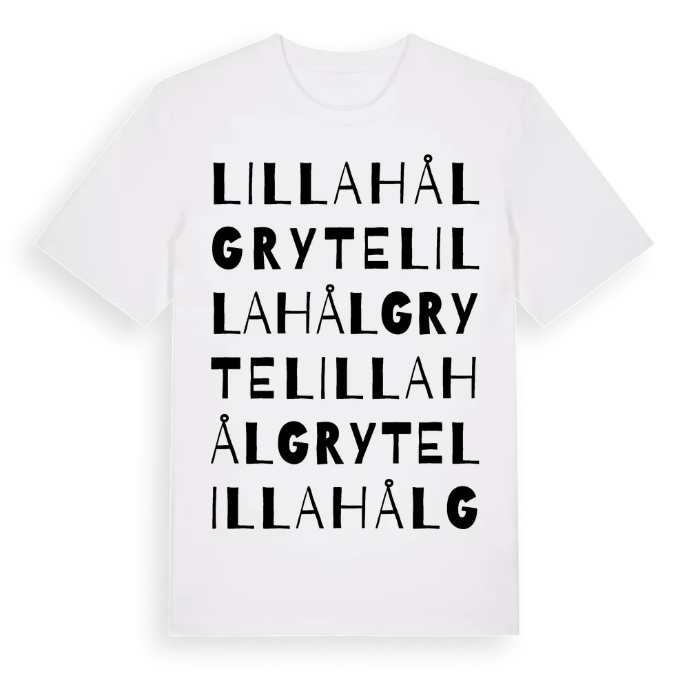 Lilla Hålgryte ordlek t-shirt är inspirerad av Lilla Hålgryte i Jönköpings län, Sverige. Tröjan är designad för dig som har en speciell koppling till platsen – oavsett om du bor här, har rötterna här eller bara älskar Lilla Hålgryte.