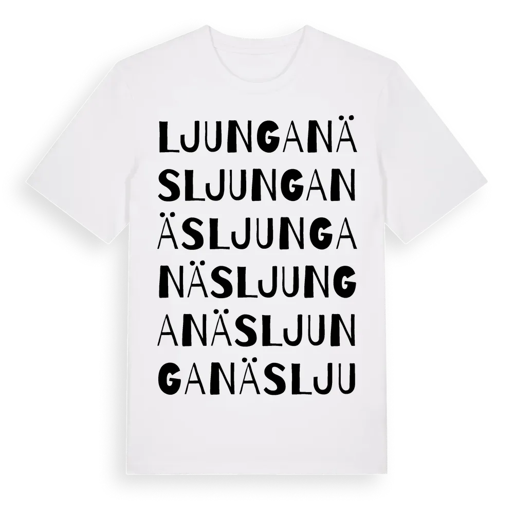 Ljunganäs ordlek t-shirt är inspirerad av Ljunganäs i Jönköpings län, Sverige. Tröjan är designad för dig som har en speciell koppling till platsen – oavsett om du bor här, har rötterna här eller bara älskar Ljunganäs.
