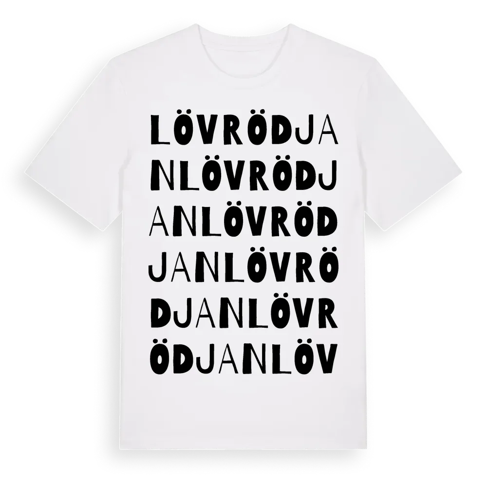 Lövrödjan ordlek t-shirt är inspirerad av Lövrödjan i Jönköpings län, Sverige. Tröjan är designad för dig som har en speciell koppling till platsen – oavsett om du bor här, har rötterna här eller bara älskar Lövrödjan.