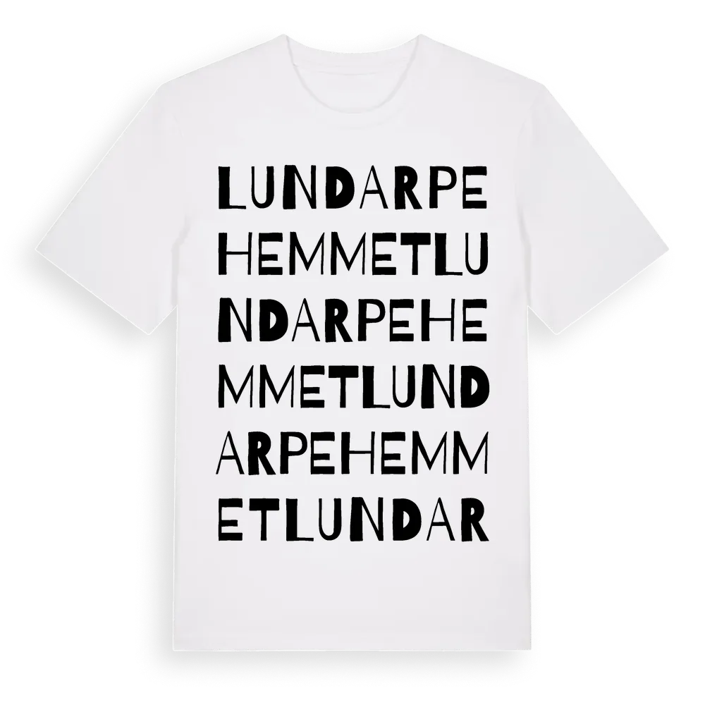 Lundarpehemmet ordlek t-shirt är inspirerad av Lundarpehemmet i Jönköpings län, Sverige. Tröjan är designad för dig som har en speciell koppling till platsen – oavsett om du bor här, har rötterna här eller bara älskar Lundarpehemmet.