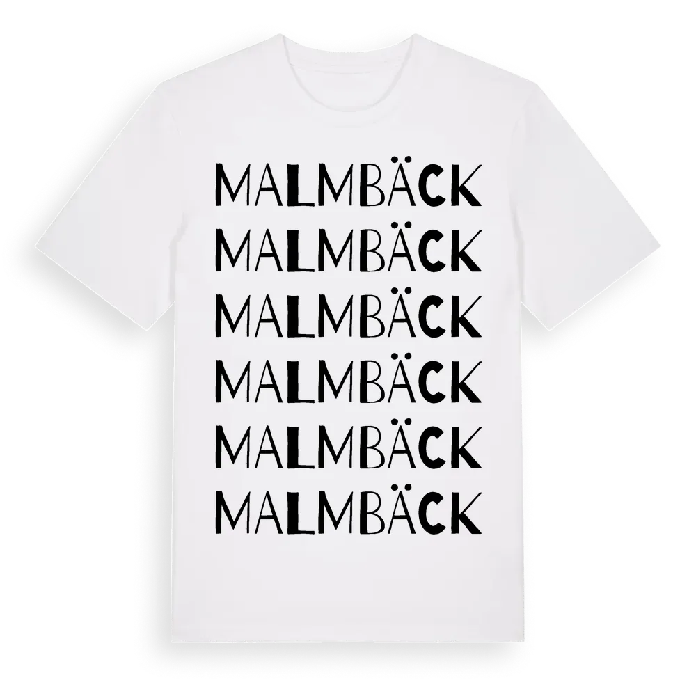 Malmbäck ordlek t-shirt är inspirerad av Malmbäck i Jönköpings län, Sverige. Tröjan är designad för dig som har en speciell koppling till platsen – oavsett om du bor här, har rötterna här eller bara älskar Malmbäck.