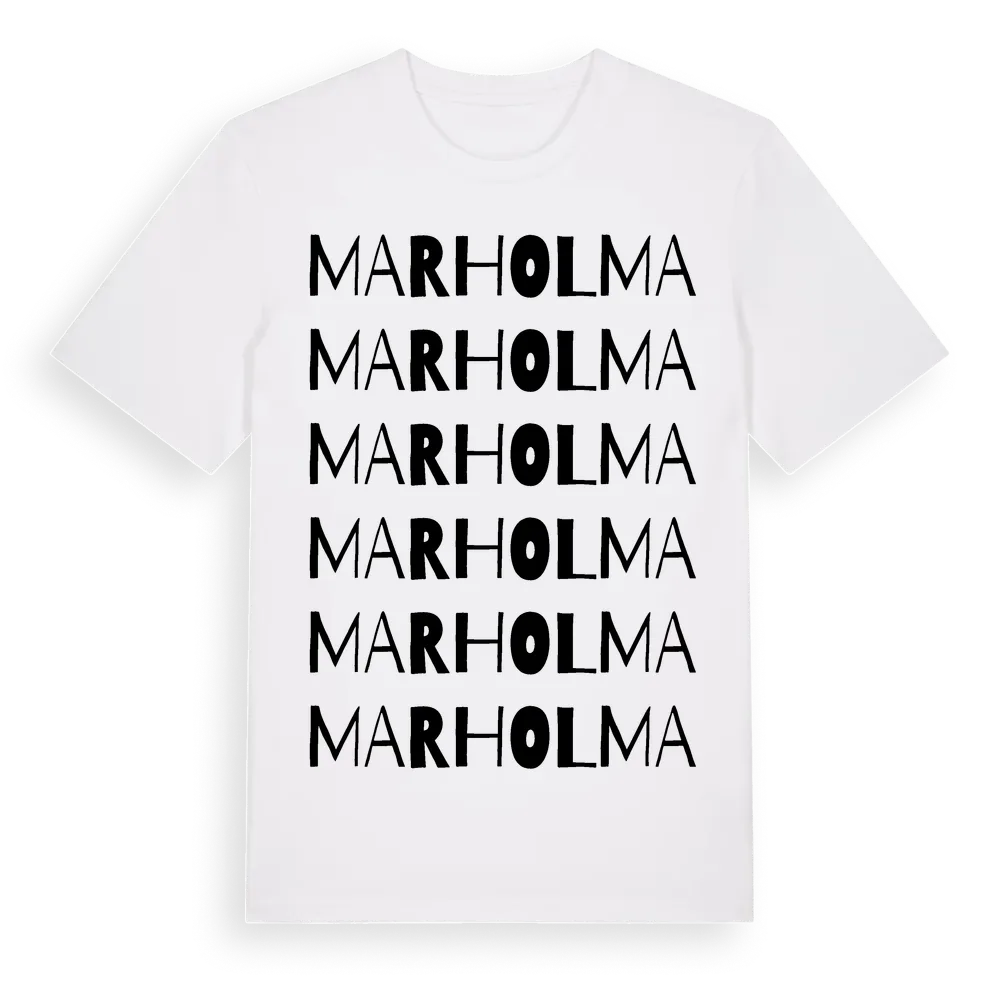 En ordlek byggd på Marholmas namn. Subtilt och klurig – ett motiv som bara de som verkligen känner platsen fullt ut förstår. Premium bomull, unisex – från byn Marholma i Jönköpings län.