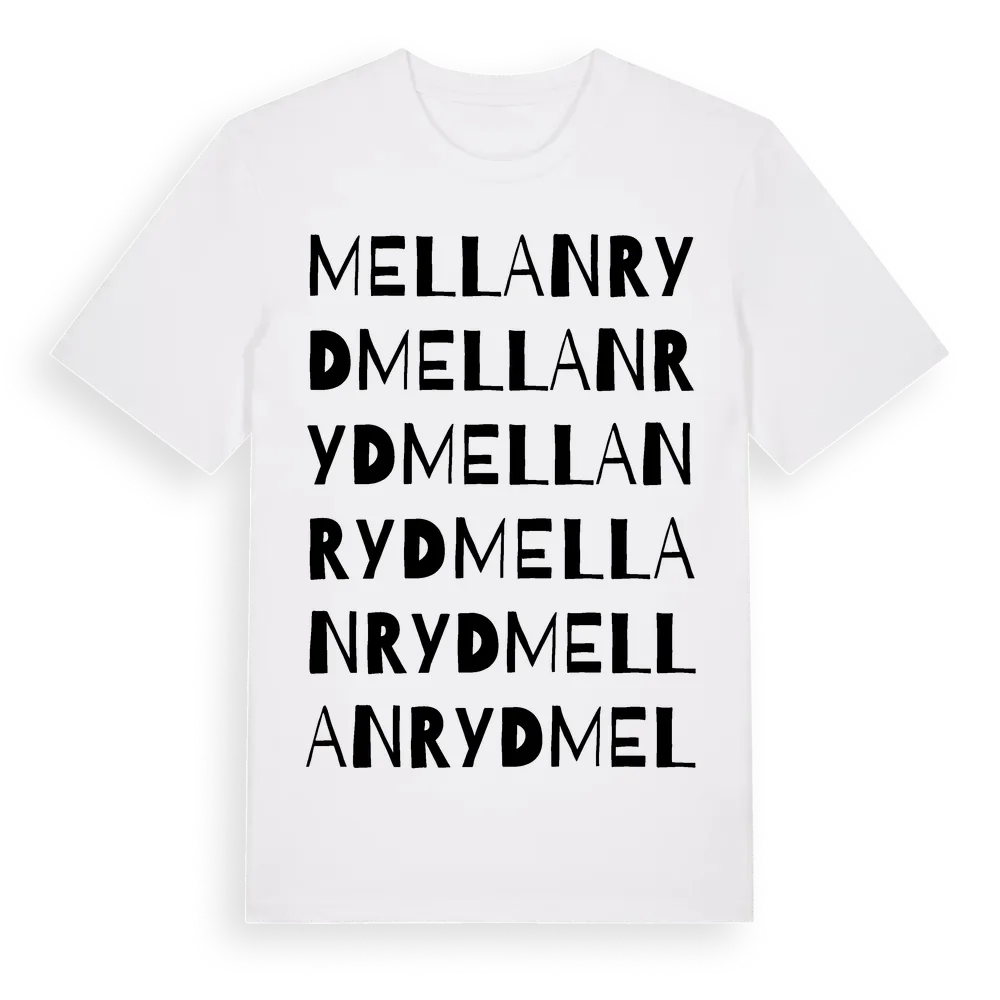 Mellanryd ordlek t-shirt är inspirerad av Mellanryd i Jönköpings län, Sverige. Tröjan är designad för dig som har en speciell koppling till platsen – oavsett om du bor här, har rötterna här eller bara älskar Mellanryd.