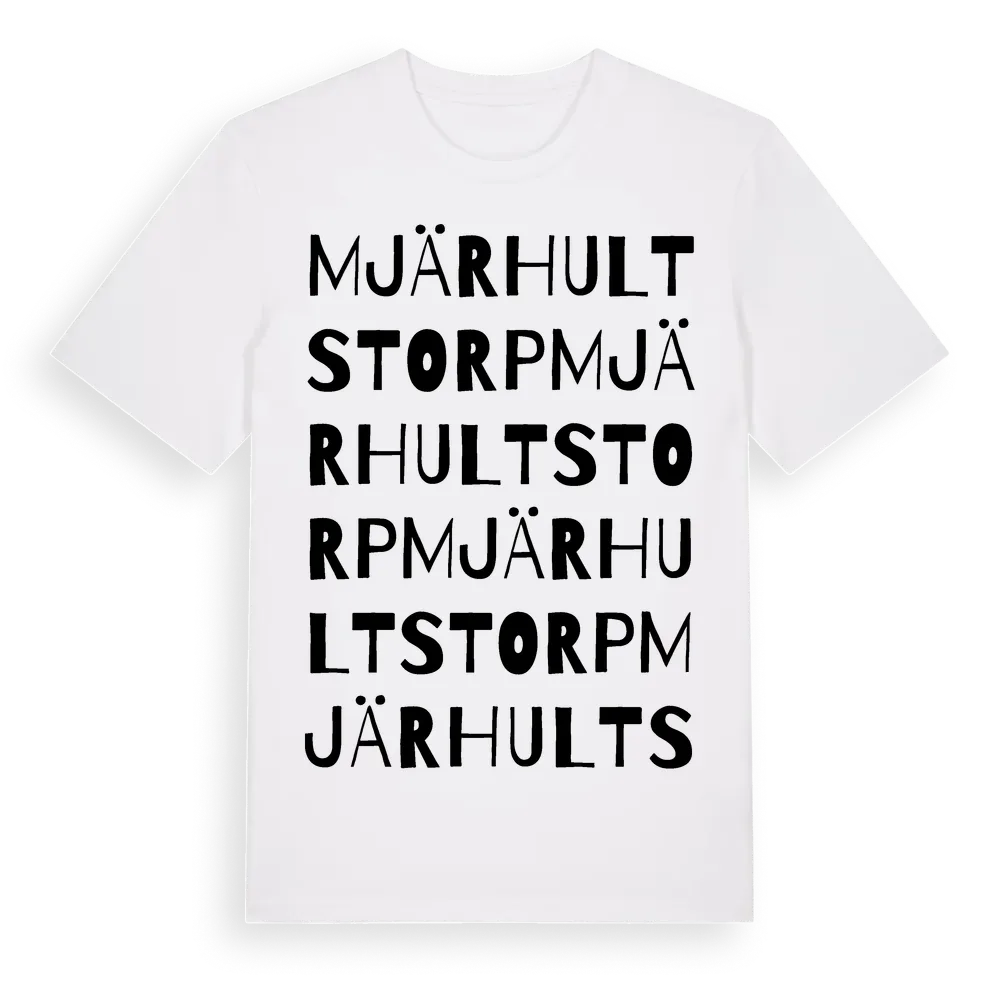 Mjärhultstorp ordlek t-shirt är inspirerad av Mjärhultstorp i Jönköpings län, Sverige. Tröjan är designad för dig som har en speciell koppling till platsen – oavsett om du bor här, har rötterna här eller bara älskar Mjärhultstorp.