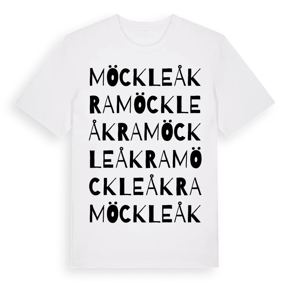 Möckleåkra ordlek t-shirt är inspirerad av Möckleåkra i Jönköpings län, Sverige. Tröjan är designad för dig som har en speciell koppling till platsen – oavsett om du bor här, har rötterna här eller bara älskar Möckleåkra.