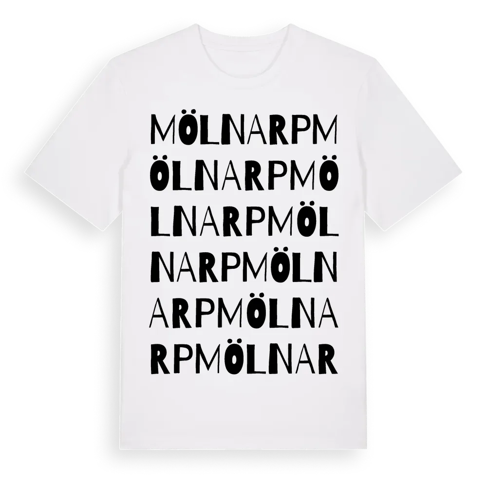 Mölnarp ordlek t-shirt är inspirerad av byn Mölnarp i Jönköpings län, Sverige. Tröjan är designad för dig som har en speciell koppling till platsen – oavsett om du bor här, har rötterna här eller bara älskar Mölnarp.