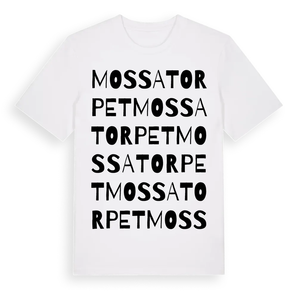 Mossatorpet ordlek t-shirt är inspirerad av Mossatorpet i Jönköpings län, Sverige. Tröjan är designad för dig som har en speciell koppling till platsen – oavsett om du bor här, har rötterna här eller bara älskar Mossatorpet.