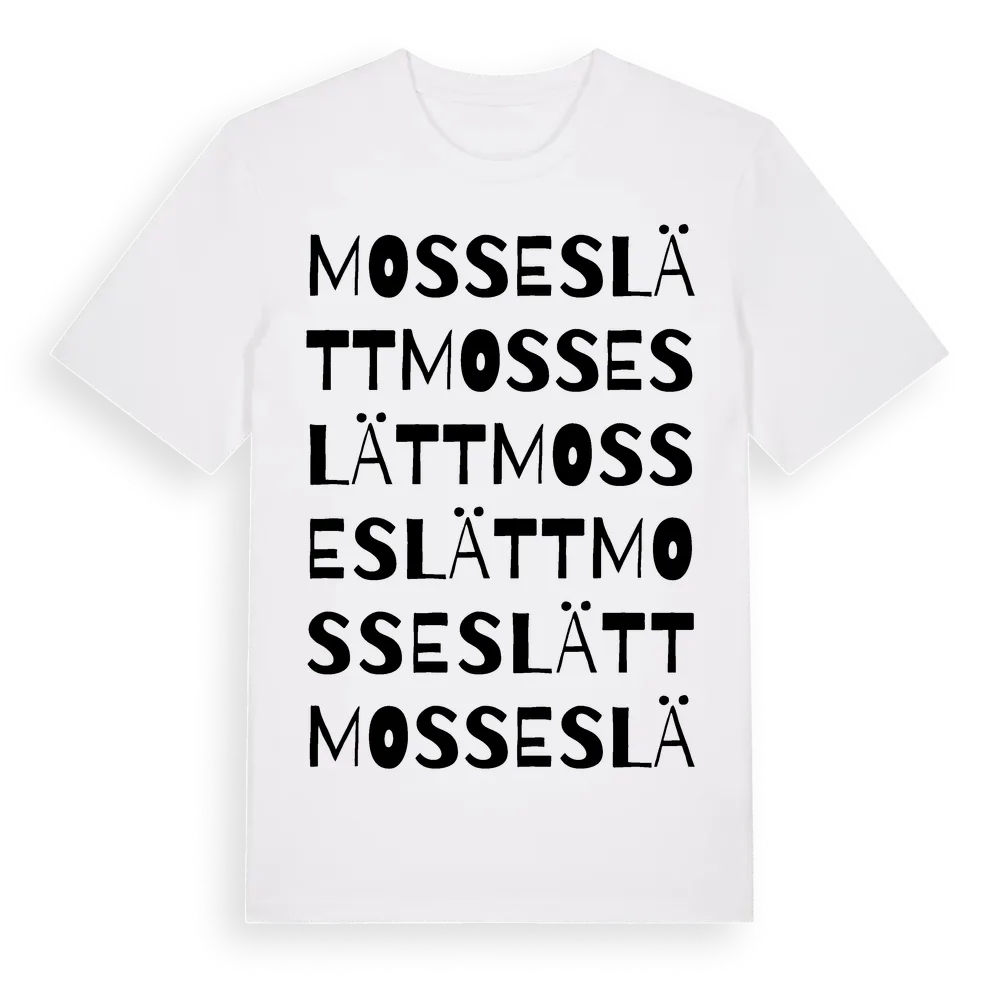 Mosseslätt ordlek t-shirt är inspirerad av Mosseslätt i Jönköpings län, Sverige. Tröjan är designad för dig som har en speciell koppling till platsen – oavsett om du bor här, har rötterna här eller bara älskar Mosseslätt.