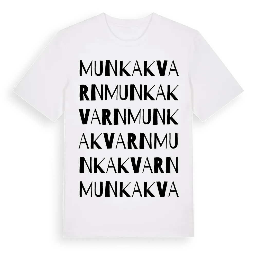 Munkakvarn ordlek t-shirt är inspirerad av Munkakvarn i Jönköpings län, Sverige. Tröjan är designad för dig som har en speciell koppling till platsen – oavsett om du bor här, har rötterna här eller bara älskar Munkakvarn.