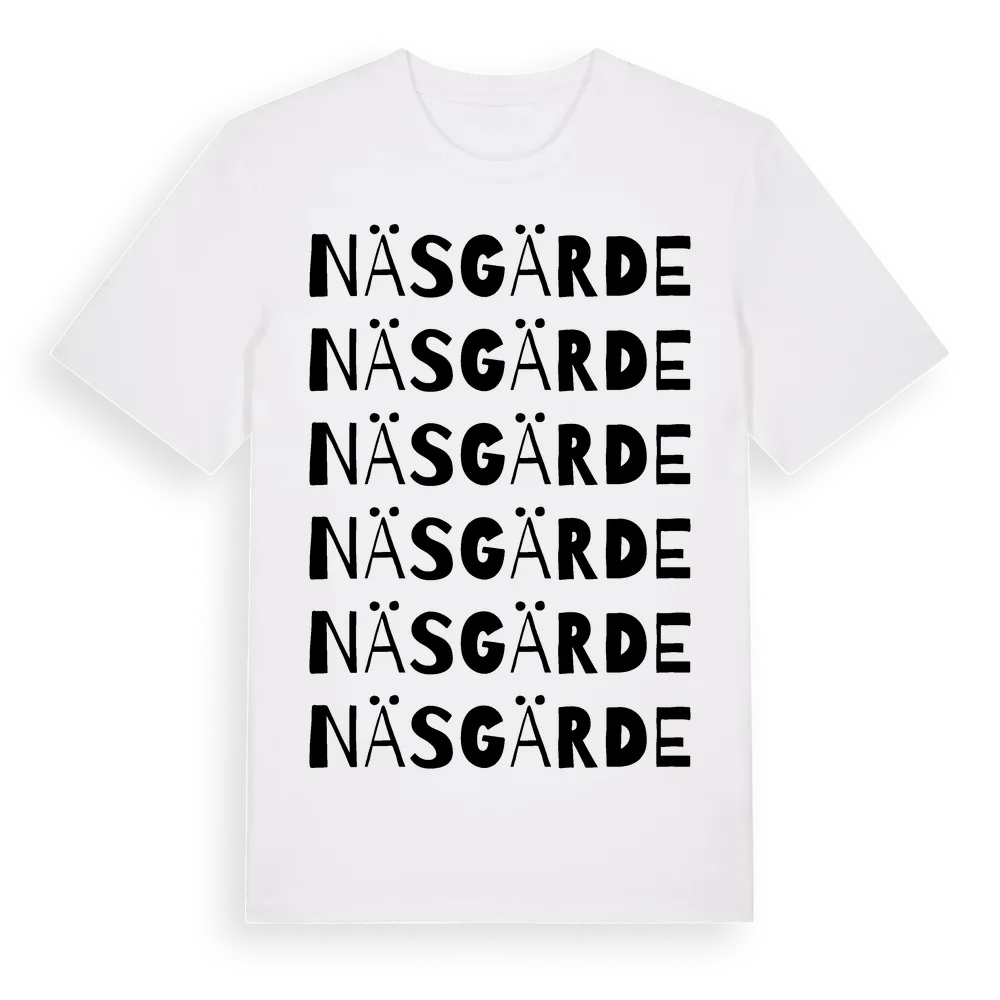 Näsgärde ordlek t-shirt är inspirerad av Näsgärde i Jönköpings län, Sverige. Tröjan är designad för dig som har en speciell koppling till platsen – oavsett om du bor här, har rötterna här eller bara älskar Näsgärde.