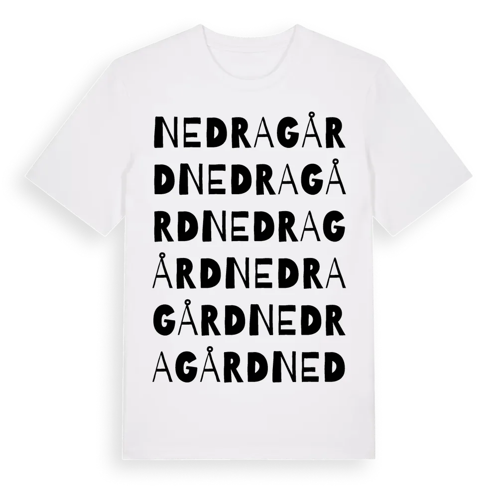Nedragård ordlek t-shirt är inspirerad av byn Nedragård i Jönköpings län, Sverige. Tröjan är designad för dig som har en speciell koppling till platsen – oavsett om du bor här, har rötterna här eller bara älskar Nedragård.