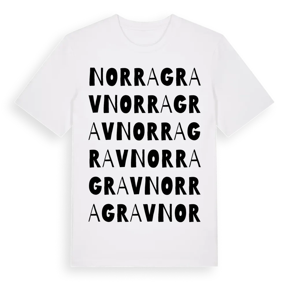 Norra Grav ordlek t-shirt är inspirerad av Norra Grav i Jönköpings län, Sverige. Tröjan är designad för dig som har en speciell koppling till platsen – oavsett om du bor här, har rötterna här eller bara älskar Norra Grav.