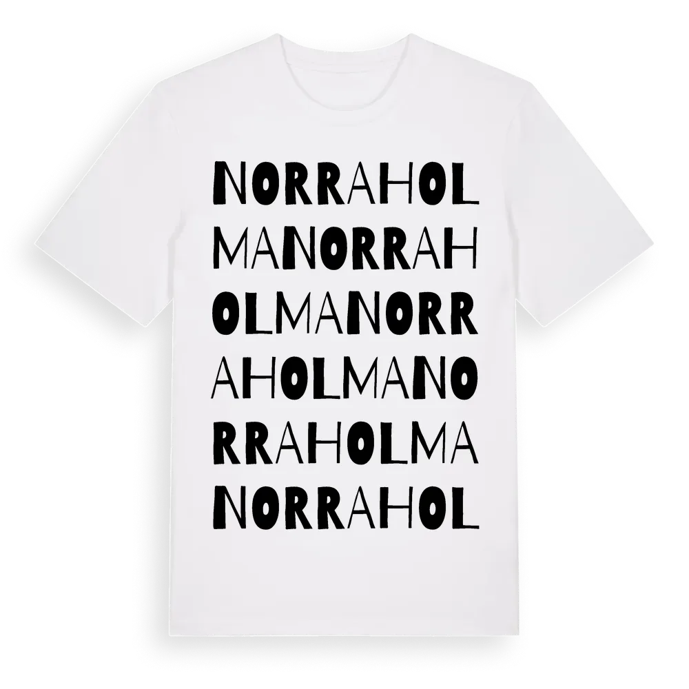 Norra Holma ordlek t-shirt är inspirerad av Norra Holma i Jönköpings län, Sverige. Tröjan är designad för dig som har en speciell koppling till platsen – oavsett om du bor här, har rötterna här eller bara älskar Norra Holma.
