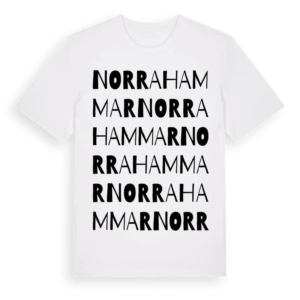 Norrahammar ordlek t-shirt är inspirerad av byn Norrahammar i Jönköpings län, Sverige. Tröjan är designad för dig som har en speciell koppling till platsen – oavsett om du bor här, har rötterna här eller bara älskar Norrahammar.