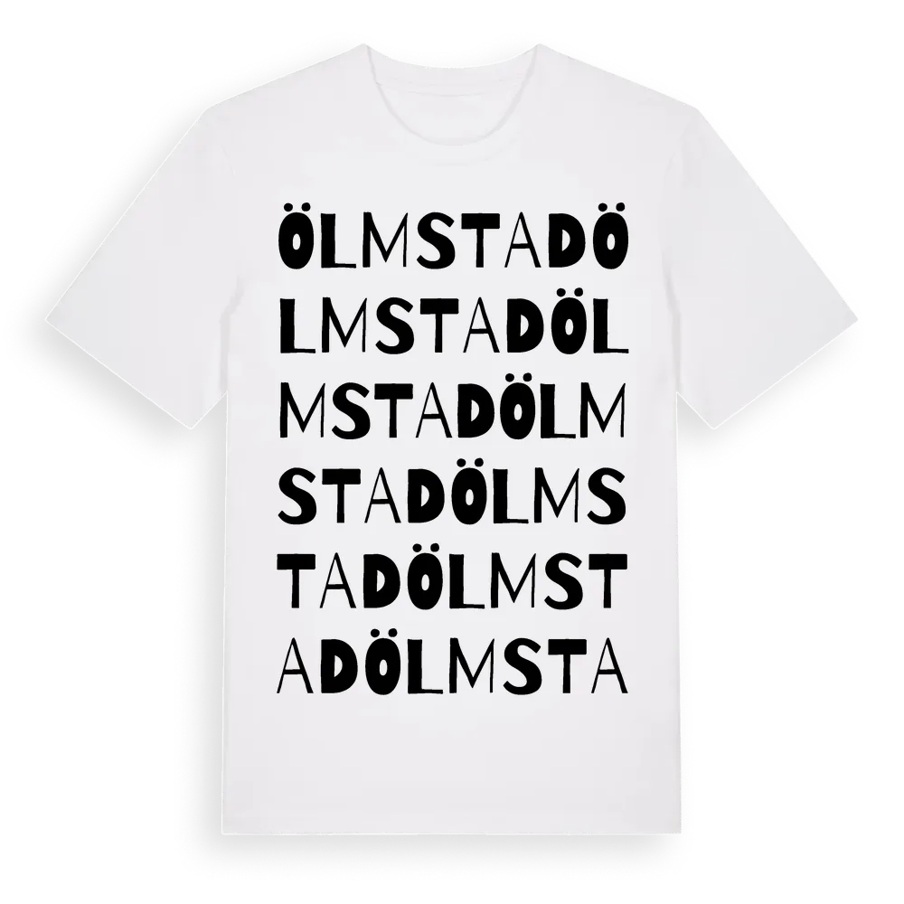 Ölmstad ordlek t-shirt är inspirerad av byn Ölmstad i Jönköpings län, Sverige. Tröjan är designad för dig som har en speciell koppling till platsen – oavsett om du bor här, har rötterna här eller bara älskar Ölmstad.