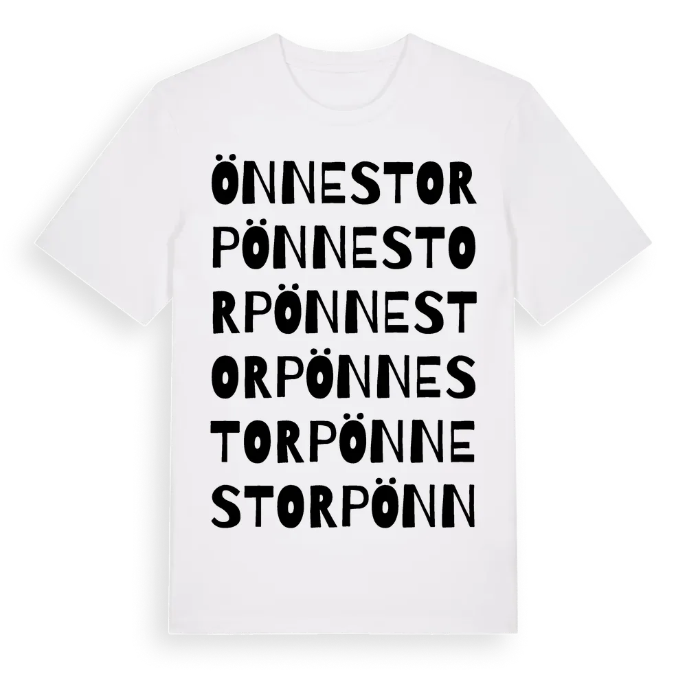 Önnestorp ordlek t-shirt är inspirerad av byn Önnestorp i Jönköpings län, Sverige. Tröjan är designad för dig som har en speciell koppling till platsen – oavsett om du bor här, har rötterna här eller bara älskar Önnestorp.