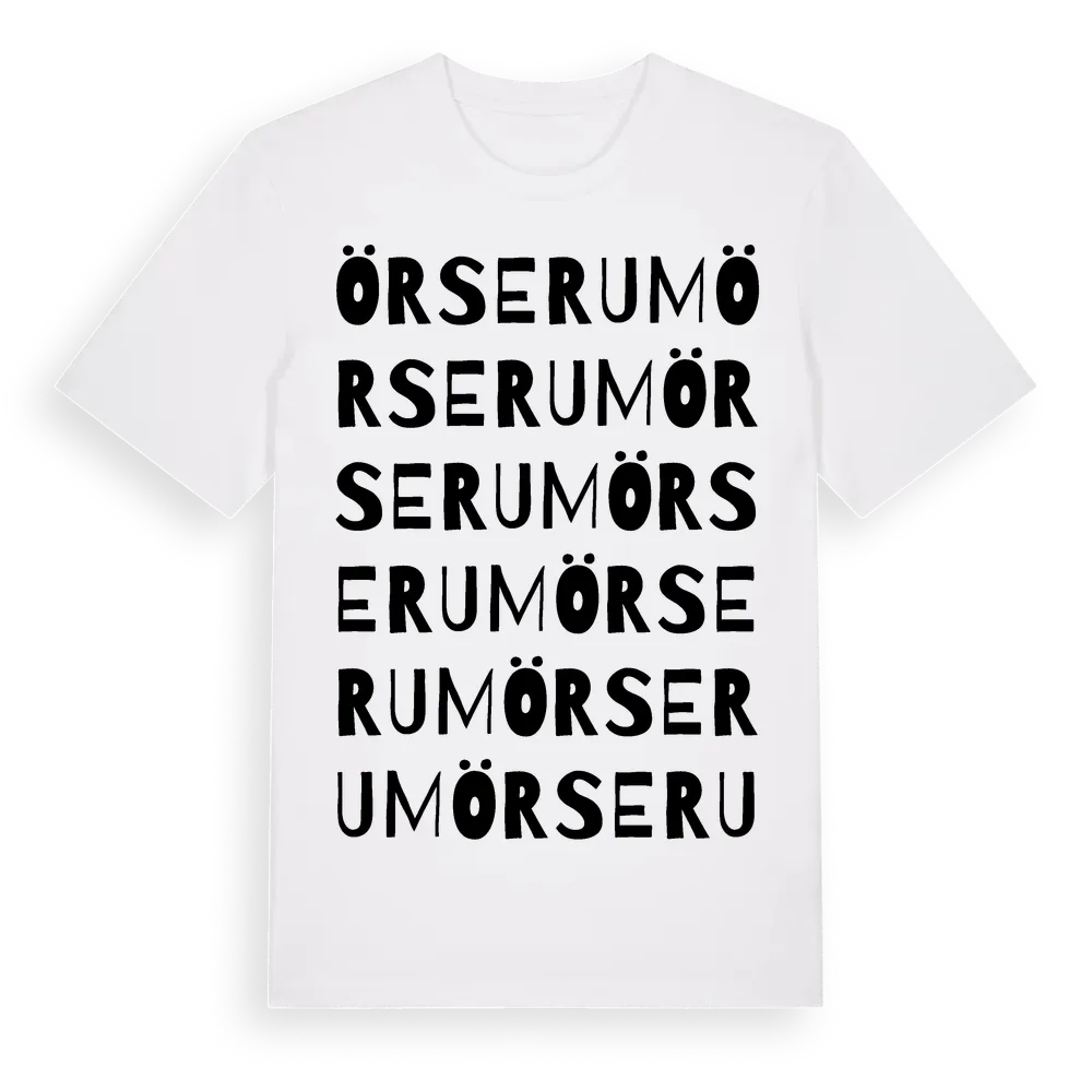 Örserum ordlek t-shirt är inspirerad av byn Örserum i Jönköpings län, Sverige. Tröjan är designad för dig som har en speciell koppling till platsen – oavsett om du bor här, har rötterna här eller bara älskar Örserum.