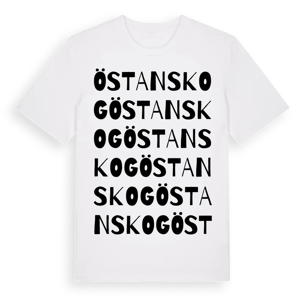 Östanskog ordlek t-shirt är inspirerad av Östanskog i Jönköpings län, Sverige. Tröjan är designad för dig som har en speciell koppling till platsen – oavsett om du bor här, har rötterna här eller bara älskar Östanskog.