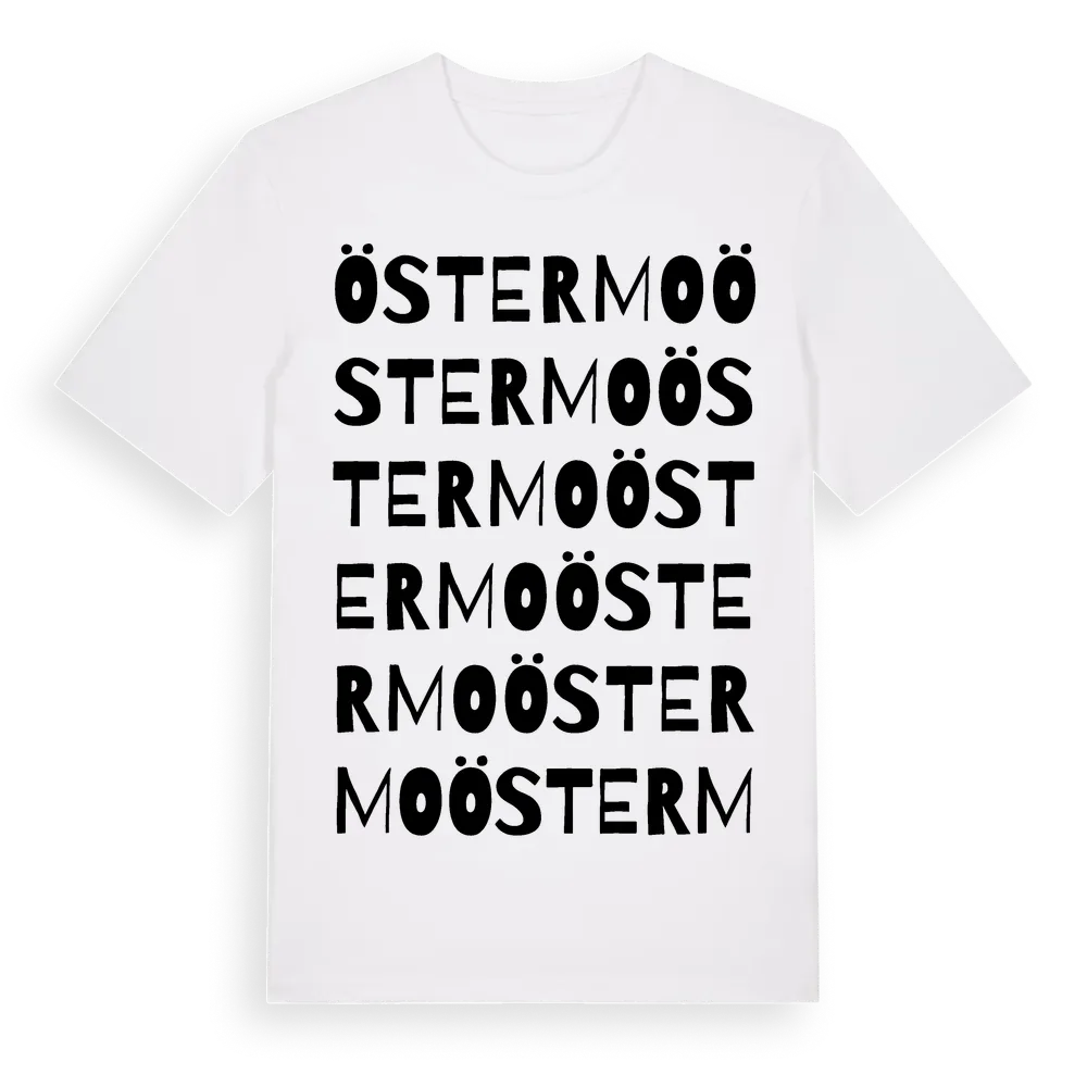 En ordlek byggd på Östermos namn. Subtilt och klurig – ett motiv som bara de som verkligen känner platsen fullt ut förstår. Premium bomull, unisex – från stadsdelen Östermo i Jönköpings län.