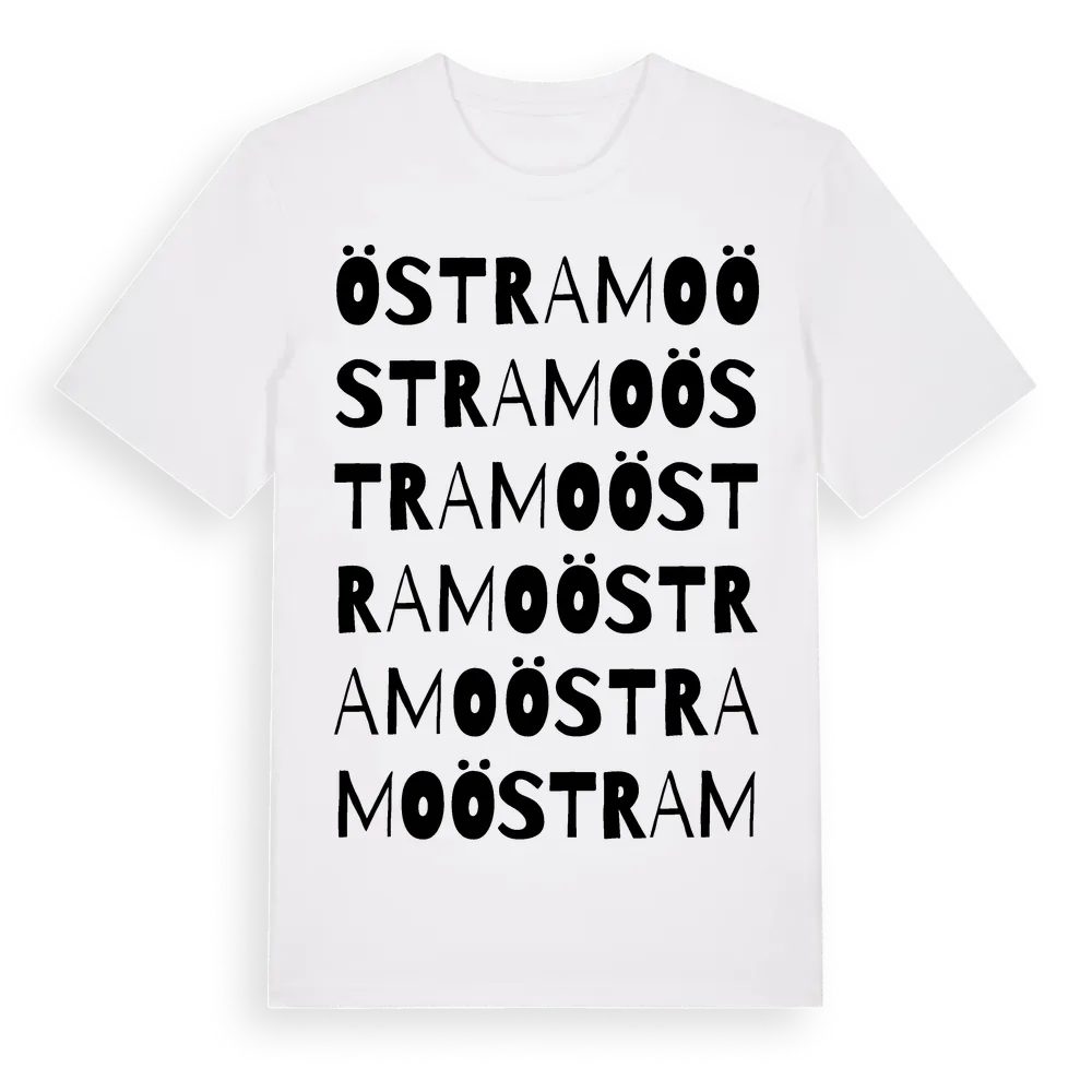 Östra Mo ordlek t-shirt är inspirerad av byn Östra Mo i Jönköpings län, Sverige. Tröjan är designad för dig som har en speciell koppling till platsen – oavsett om du bor här, har rötterna här eller bara älskar Östra Mo.