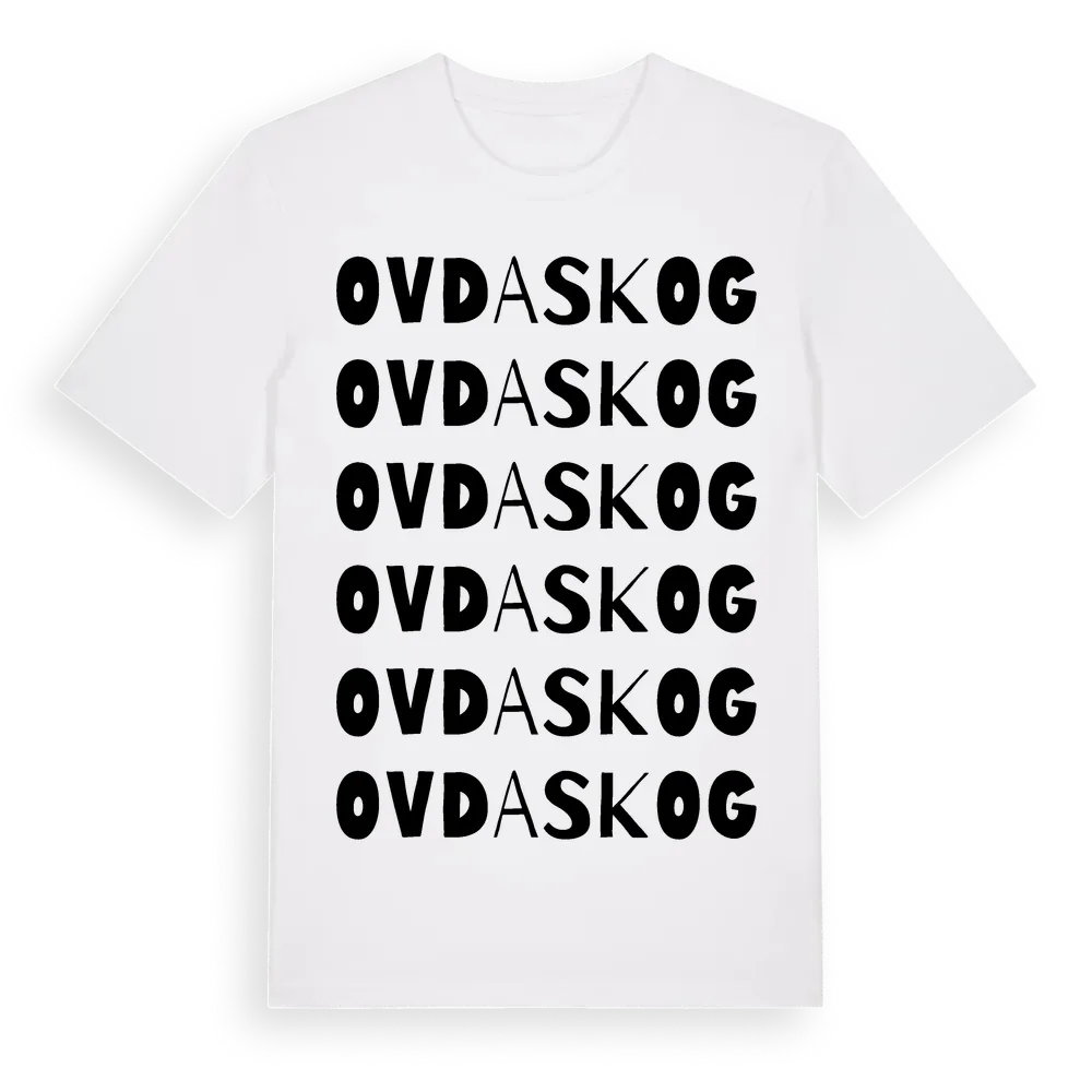 Ovdaskog ordlek t-shirt är inspirerad av byn Ovdaskog i Jönköpings län, Sverige. Tröjan är designad för dig som har en speciell koppling till platsen – oavsett om du bor här, har rötterna här eller bara älskar Ovdaskog.
